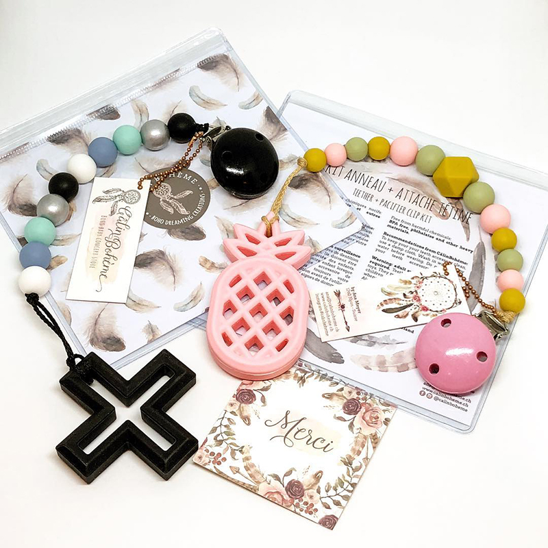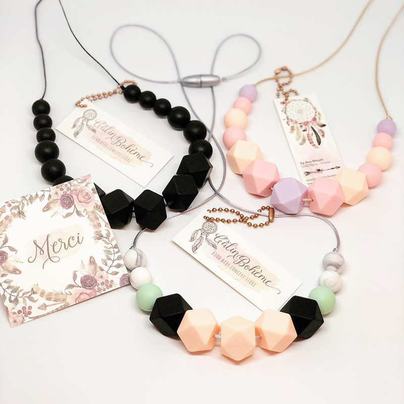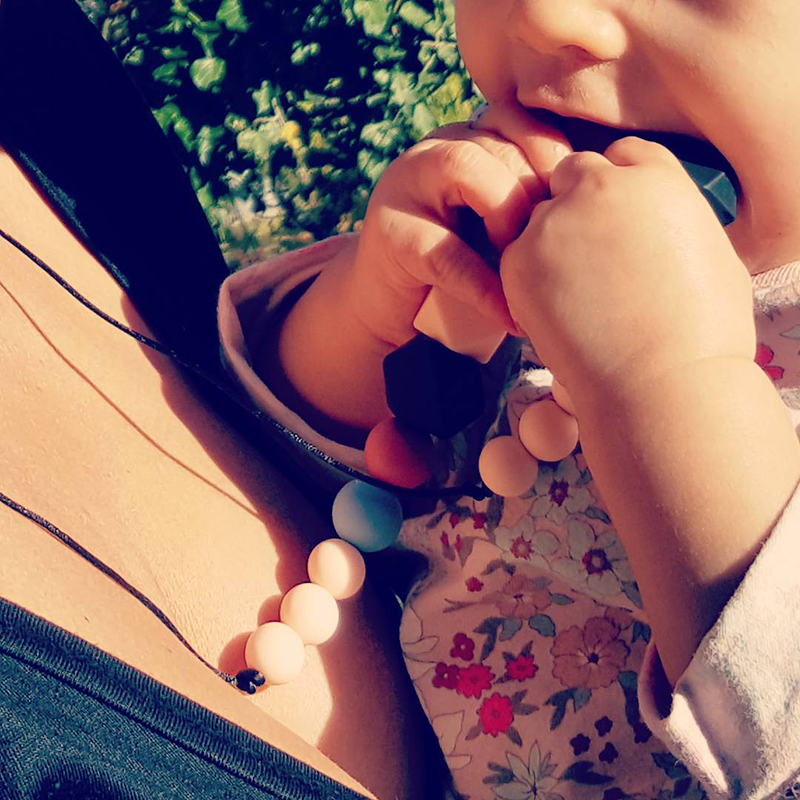 Colliers de portage et d'allaitement tendance pour jeunes mamans, accessoires de dentition pour bébés et bijoux stylés non toxiques pour enfants réalisés en silicone alimentaire et bois naturel.